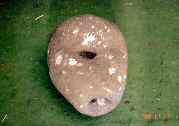 发现蚝岗遗址之后又过了10年,1998年美国学者莫伟棠(洋人取中文名)由中山大学教授张寿祺和本市作家张磊及市外事办工作人员陪同,到我市考察水上渔民风俗,我作为向导带他们一行考察蚝壳山贝丘遗址。多年未去,只见山边长满杂草,山顶建起楼房,遗址边新建一座神庙。我在学者们考察遗址时,漫步到遗址另一边,见到那里也新建一间小庙,里面放了许多块村妇认为有神秘力量的大块河卵石供人膜拜。忽然我见到一块形状像木瓜的河卵石有人工钻孔的痕迹,它在小头底正中间向里钻了一个孔,又在卵石扁平面的大头到小头距离的五分之三的位置向里钻了一个孔,两孔在里面贯通。我觉得这块人工加工过的河卵石有点来历,过了几天后,我又去小庙考察。